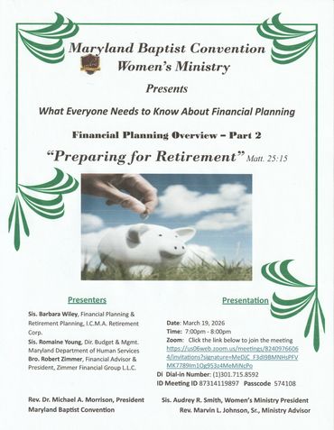Thurs. Mar. 19th @ 7 pm virtual MBC Women’s ministry meeting, topic: Retirement Planning